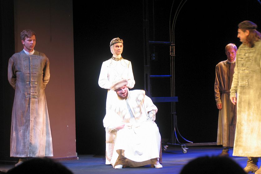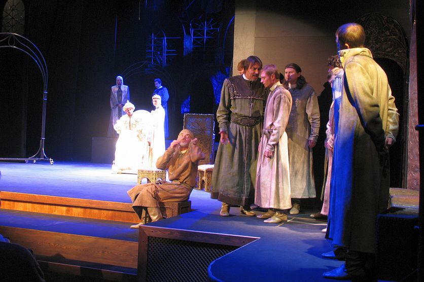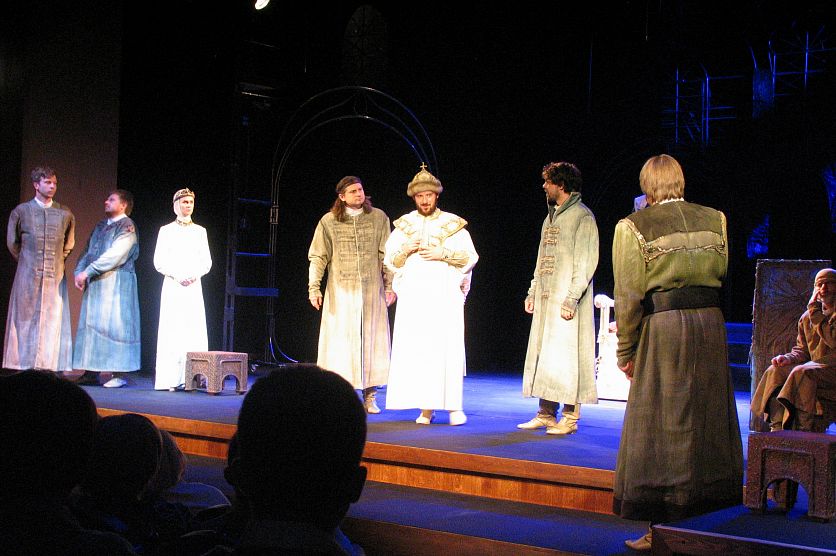Старый ОсколНовостиНовости искусства и культурыПремьера в возрождённом храме искусства: «Царь Федор Иоаннович» в старооскольском театре Премьера в возрождённом храме искусства: «Царь Федор Иоаннович» в старооскольском театре Евгения Мишина 09.09.2017 16:25 Культура 6095 Фото: vk.com/club25785546. На сцене реконструированного и теперь неузнаваемого Старооскольского театра для детей и молодёжи имени народного артиста СССР Б.И. Равенских представили премьеру спектакля «Царь Федор Иоаннович». Обновлённый театр вызывает у всякого, кто переступает его порог, бурю восторгов и радости. И это не удивительно, ведь театр должен воспитывать чувство прекрасного в человеческой душе в том числе и своим внешним видом. Видом храма искусства, который заставляет зрителя думать и переживать, скорее, даже сопереживать происходящему на сцене. Интерьер, пища духовная и не только… Фойе театра утопает в сдержанной роскоши. Крупные люстры заливают все помещения мягким мерцающим светом. Кофейные тона разной насыщенности радуют глаз, а напоминающая античные колонны лепнина так органична, будто находится здесь с самого основания здания. Комфортные и изящные диванчики ни за что не дадут зрителю устать в ожидании спектакля. Театральный музей (отдельно платить за вход не нужно) пока что не может похвастаться богатством экспозиции, но представленное оформлено со вкусом, так, что хочется подолгу рассматривать каждый экспонат. Однако наш театр ещё очень молод (ему всего-то 21 год!), поэтому, возможно, старооскольцы и гости города в будущем смогут насладиться новыми выставками. Пища духовная обычно плохо поглощается, когда завывает в желудке, поэтому того, кто волею судьбы или работодателя перед спектаклем не успел поужинать, может обрадовать и то, что в театре снова работает небольшой буфет, где можно заглушить урчание горячим чаем или молочным коктейлем с забавным пирожным в виде барашка или поросёнка. С первого взгляда даже может показаться, что большой зал достоин стать отдельной от всего остального здания театра достопримечательностью города. Зрительный зал по сравнению с тем, что был закрыт на бесконечно долгий ремонт в 2010 году, кажется, уменьшился, но зато здесь появились удобные резные кресла, между которыми широкие проходы – теперь тот, кто проходит к месту в середине ряда, вряд ли сильно побеспокоит сидящих с краю. Зритель с ограниченными возможностями здоровья здесь ограничений не почувствует, ибо заехать в зал можно прямо от гардероба к специально отведенному для колясок свободному месту. О техническом же оснащении сцены и другом оборудовании, которое создает неповторимую атмосферу, можно рассказывать долго-долго, но лучше увидеть – это не оставит равнодушным даже самого капризного. Кстати, не так давно в свет вышел презентационный буклет об обновлённом театре, выпущенный на средства Металлоинвеста. Сюжет ТРК «Мир Белогорья» об обновлённом театре. О трагедии Трагедия А.К. Толстого «Царь Фёдор Иоаннович» прошла нелёгкий путь к сценическому воплощению. 30 лет минуло с момента публикации пьесы до того, как в 1898 году в урезанном, искалеченном цензурой варианте она наконец была поставлена на сцене Московского Художественно-Общедоступного театра. Именно ей этот театр (ныне МХАТ) обязан первой популярностью и оглушительными аплодисментами. Главный герой