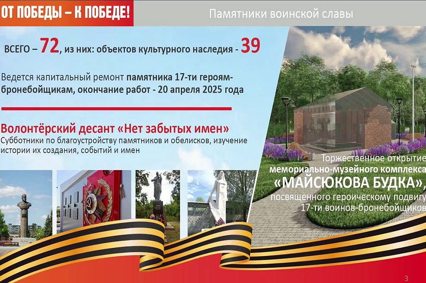 Старый ОсколНовостиНовости Старого Оскола и Белгородской областиВ Старом Осколе в преддверии Дня Победы откроют обновлённый мемориал «Майсюкова будка» В Старом Осколе в преддверии Дня Победы откроют обновлённый мемориал «Майсюкова будка» 18.02.2025 09:17 В Старом Осколе и области 1101 Фото: Ольги Ульяновой (архив) Глава администрации Старооскольского округа Владимир Жданов на оперативном совещании правительства области 17 февраля представил масштабный план мероприятий, посвящённый 80-летию Победы в Великой Отечественной войне. По его словам, в общей сложности в этом году в честь памятной даты запланированы более 1 100 мероприятий. Власти округа разработали концепцию «8 касаний», охватывающую памятными мероприятиями все поколения старооскольцев — от ветеранов до дошкольников. В центре внимания, конечно, будут непосредственные свидетели тех событий – в округе сегодня проживают 6 участников Великой Отечественной войны и 357 ветеранов. Их постараются окружить вниманием и заботой. «Первое «касание» – это личное поздравление каждого. Их подвиг – наша гордость и ориентир!», – заверил Жданов. На концерты хотят пригласить более чем 7,5 тыс. детей войны, проживающих в округе, а юные тимуровцы в рамках акции «Дети-детям» окажут помощь ветеранам. Город к празднику украсят патриотические муралы. Уже сейчас на двух остановках размещены портреты Героев Советского Союза Акима Васильевича Репкина и Анатолия Андреевича Анпилова. Но главное зрелище будет ждать старооскольцев не в городе, а на его подступах: «В преддверии Дня Победы завершится реконструкция мемориала «Майсюкова будка» – места, памятного для горожан. Объединение «Поиск» воссоздаст события того легендарного боя, оживив историю для всех присутствующих на открытии», – рассказал глава администрации. По его словам, продолжит свои экскурсии для туристов ретро-поезд «Дорогой мужества Старый Оскол – Ржава», хотя в последнее время эти рейсы отменяли. В образовательных учреждениях детям расскажут о вкладе местных предприятий в общую Победу. В плане есть и другие ключевые события, например: парад духовых оркестров «Победный марш»; офицерский бал Победы; фестиваль-конкурс молодёжных музыкальных команд и отдельных исполнителей «Гвозди»; фестиваль солдатской каши; граффити-фестиваль «Герои родного города»; акция «Поющий автобус». В тему: Дети войны в Белгородской области получат единоразовую выплату к 9 Мая в размере 5 тыс. рублей. На эти цели направят 262 млн рублей из резервного фонда. Также власти предложили установить муниципальные выплаты ко Дню Победы, которые составят 20 тыс. рублей, для участников Великой Отечественной войны и 1 тыс. рублей – для остальных категорий ветеранов. Фоторепортаж: победа Победа в Великой Отечественной войне ВОВ планы День Победы Майсюкова будка Мы в Telegram Вернуться к списку новостей Предложить новость